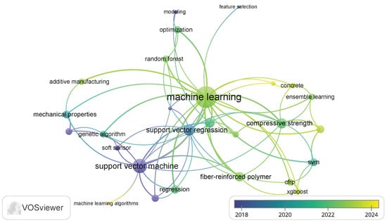 The keyword occurrence map (Figure 3) reflects diverse and interdisciplinary research areas, emphasizing the integration of ML and advanced modeling techniques with polymer science, materials engineering, and sustainability studies. Topics like infrared spectroscopy, chemometrics, and regression highlight analytical and predictive modeling applications. Keywords such as fly ash, geopolymer, and sustainability emphasize green materials and environmental considerations.