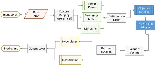 Figure 5 illustrates the inner workings of the SVM model, from the input layer (data) to the output (classification), with a focus on the role of support vectors and the application of kernel methods.