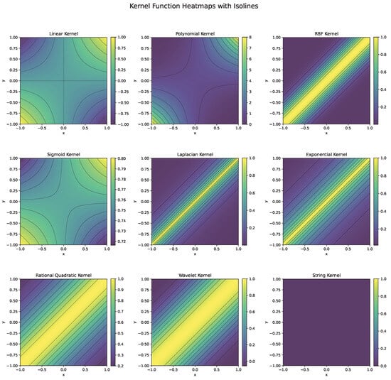 Figure 6. Heatmaps and isolines of kernel functions used in SVM.
