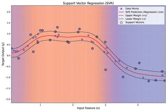 Figure 7 illustrates the application of SVR to a nonlinear regression problem. The red line represents the regression function w T x + b , while the dashed black lines indicate the margin of tolerance ( ± ε ). Data points within the margin are ignored, while those lying on or outside the margin, termed support vectors, are highlighted with black circles. A gradient background visually represents the regression regions, transitioning from blue to red with transparency for esthetic clarity.