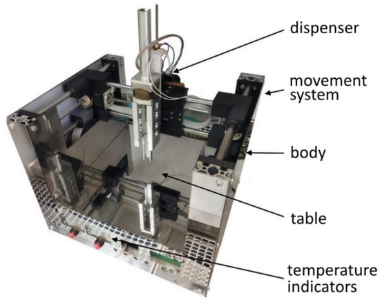 The production of the three-dimensional PLGA scaffolds was carried out on a custom-built 3D printer (Federal Scientific Center “Crystallography and Photonics” of the Russian Academy of Sciences) (Figure 1) controlled with RepetierHost software (v2.2.4, Willich, Germany). The basis of the printer is a motorized system that provides precise movement of the stepper motor driven syringe dispenser in three dimensions. During the printing process, the polymer solution was deposited on distilled water at coordinates specified in the three-dimensional (3D) digital model. The 3D structure was formed by the method of antisolvent precipitation through the diffusion of tetraglycol from the polymer solution into water.