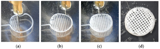 PLGA scaffold 3D printing (a–c) and solidifying (d).