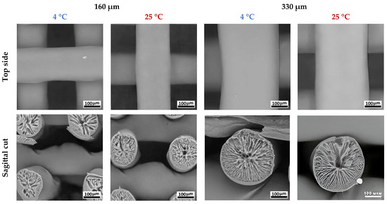 A comparative analysis of the microstructure of the samples showed differences in pore distribution across the fiber cross-section depending on printing conditions. As the temperature increased from 4 °C to 25 °C, a structure formed by large, radial, finger-like pores with characteristic dimensions of 30–50 μm was replaced by a network of smaller pores up to 30 μm in length (Figure 5). For fibers with a diameter of 190 μm, the difference in pore size formed at 4 °C and 25 °C was 30–50%. For fibers with a diameter of 350 µm, the differences in large pore size did not exceed 10%. The mean volume of a single pore formed during antisolvent printing directly depended on polymer precipitation time, as larger voids were a product of initial microphase merging. Higher temperatures led to faster polymer precipitation and blocked pore growth. At the same time, a larger depot of solvent in the case of thicker fibers allows the polymer solution to anticipate temperature rises and remain in the liquid state for longer, forming larger pores [15,19].