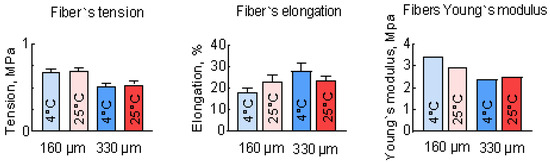 To investigate the tensile strength of the individual fibers, a tensile test was conducted. The results of these tests are shown in Figure 6. The Young’s modulus of these samples was calculated as the linear coefficient in the linear relationship between shear stress and strain. Thinner fibers showed greater rigidity, with a breaking force that was about 20% higher than that of thicker fibers. Temperature increases lead to a decrease in Young`s modulus and elongation at break, but this effect is not so pronounced for fibers with a diameter of 350 μm. These results are in good relation with the observed difference in the fibers’ inner structure (Figure 3), where the 350 μm fibers are much more uniform than the 190 μm fibers. The obtained results show that the tensile strength of the scaffold cannot exceed 0.7 MPa even if it has a monolithic macrostructure, which makes it suitable only for bone defect implantation with externally compensated or low tensile load.