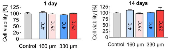 Using the MTT assay, it was shown that during the first 24 h, no statistically significant differences in relative cell viability were observed. After 14 days, however, the number of viable cells in the presence of the scaffolds prepared with a 160 μm nozzle at 4 °C (Figure 9) even exceeded the control values, reaching 111.6 ± 1.5%.