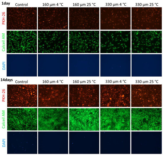 For cell adhesion analysis, PKH-26 staining (red fluorescent cell linker kit, Sigma-Aldrich, St. Louis, MO, USA) was used. PLGA-based 3D scaffolds were placed in the bottom of 24-well plates, and a cell suspension pre-stained with the red fluorescent dye PKH-26 (following the manufacturer’s instructions) was added on top. Cells were incubated with the scaffolds for 1 and 14 days, and at the end of the experiment, live cells were identified using the vital dye Calcein AM (0.5 µM, Biotium, Fremont, CA, USA) for 35 min at 37 °C. Apoptotic cells were detected with the fluorescent dye DAPI (4,6-diamidino-2-phenylindole) at 1 µg/mL for 10 min. The Lionheart FX automated microscope (Agilent BioTek, Santa Clara, CA, USA) was used to perform fluorescence microscopy analysis.