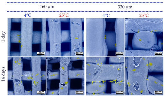 Cells attached to the scaffolds. SEM images after 1 day and after 14 days of culture. Blue—PLGA scaffold surface, yellow—cells.