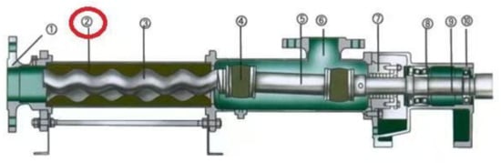 Figure 1 shows the structure of a single-screw pump. The stator of this single-screw pump, as shown in Figure 1②, is one of the most important parts of a single-screw pump and is used to realize liquid transfer and increase pressure. The inner cavity of the screw pump stator is spiral. When the screw rotates, the liquid is inhaled, pushed forward along the spiral groove, and then discharged [1].