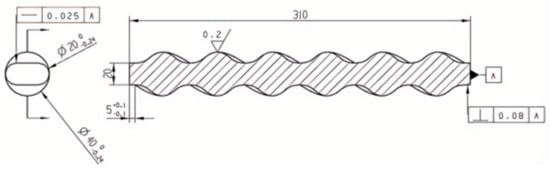 The core and the cavity cooperate with each other and are located in the internal center. When the rubber fills the cavity, the molded part, which is withdrawn by the spiral movement of the core, retains the double helix structure inside the stator. The total length of the die core is 310 mm. According to the set eccentricity e = 10 mm, pitch t = 100 mm, number of stages K = 3, rotor diameter D = 20 mm, use UG to draw the core structure by sketching, sweeping, and helical lines. The two-dimensional diagram is shown in Figure 5 [10].