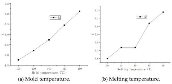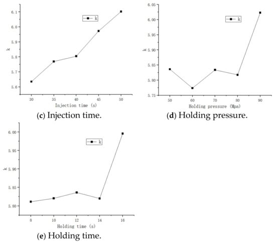 According to the data in the table, the extreme values of volumetric shrinkage rate and sink index were calculated as shown in Table 4 and Table 5, respectively, where K1, K2, K3, K4, and K5 (the sum of all the levels under each factor), k1, k2, k3, k4, and k5 (the total sum divided by the number of levels yields the mean value of each level for each factor), and the maximum mean minus the minimum mean value for each factor is the extreme value R.