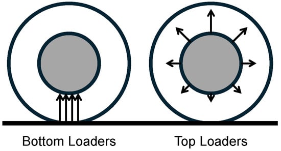 To comprehend the evolution of NPTs, it is imperative to consider the historical context. Rhyne and Cron [14] investigated the advantages of pneumatic tires over the stiff non-pneumatic wheels that were prevalent before John Dunlop’s invention of the pneumatic tire in 1888 [15]. Their findings underscore multiple advantages of pneumatic tires. One of those is their low contact pressure, approximately equivalent to their inflation pressure. This characteristic facilitates high coefficients of friction, prolonged wear, and diminished surface damage to roads. In contrast, stiff NPTs exhibit exceedingly high contact pressure. Rhyne and Cron proposed a potential solution to mitigate this issue: the incorporation of a “shear beam”. They argued that rigid isotropic outer rings mimic the behavior of a bending beam, resulting in line pressures (at the initiation and conclusion of the contact patch). The shear beam concept involves two rigid inextensible membranes as the outer and inner rings, with a material possessing a low shear modulus between them. Gasmi et al. [16] researched this subject further, developing a comprehensive two-dimensional model of a top-loading NPT. Top-loading behavior, also observed in pneumatic tires, is generally preferred for NPTs over bottom-loading configurations; see Figure 2. Bottom loading means the load or force is supported from beneath the wheel hub. Top loading means the load or force is transferred through the outer ring of the tire to the top and applied to the hub from there.