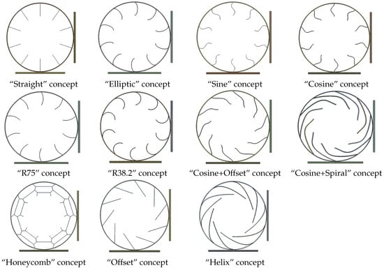 The empirical designs, namely “Elliptic”, “Sine”, “R75”, and “R38.2” exhibited distinctive characteristics. The “Elliptic” design comprised elliptically shaped spokes tangentially connected to both the outer ring and the rim. The “Sine” design introduced a single sine phase with an amplitude of 10 mm and zero passages at the outer ring, at the rim, and in between both. The “R75” and “R38.2” designs featured circular segments with radii of 75 mm and , respectively. The other concepts were related to the literature or theoretical background. The “Cosine” design was derived from the fact that the function of the buckling torque in a beam fixed on both sides is a cosine function [21], and its amplitude was set to 10 mm. Notably, the “Cosine” design shares similarities with the Unique Puncture-proof Tire System (UPTIS) created by Michelin [22]. The “Straight” design was inspired by the Tweel concept [23], while the “Honeycomb” design was inspired by the Resilient Technologies airless tire [24]. Moreover, the “Helix” and “Offset” designs were influenced by the Bridgestone airless tire concept [25]. The “Cosine + Offset” and “Cosine + Spiral” concepts, also rooted in the aforementioned Bridgestone design, additionally incorporated a superimposed cosine function, aiming to enhance the stress distribution based on the principles observed in the “Cosine” concept.