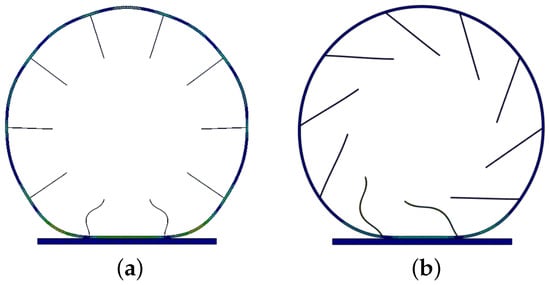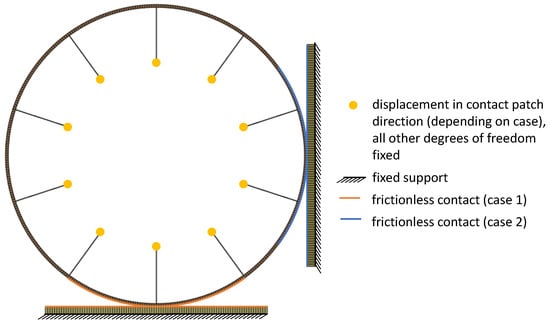 The ground planes were fixed in all degrees of freedom. A displacement of 20 mm was applied at the inner edges of the spokes in a vertical direction to the ground. All other degrees of freedom, including nodal rotations, were fixed at the inner edges of the spokes; see Figure 4. This approach eliminated the need to incorporate a rim structure in the analysis, simplifying the problem to a rigid rim—a reasonable assumption for most automotive applications. Furthermore, frictionless contacts linked the outer ring of the tire to the ground and were enforced between the spokes and the outer ring to prevent the penetration of spokes through the outer ring of the tire. Furthermore, given the finite displacement hypothesis and the contacts, a nonlinear solver was used to solve the finite element analyses.