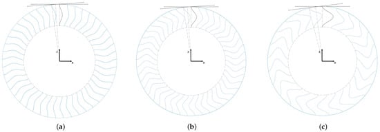 For the cosine design, shown in Figure 5, three different amplitudes, a, were chosen for the cosine function: 5 mm, 10 mm, and 20 mm. The spokes’ designs were equation-driven using Equation (1), where x and z denote Cartesian coordinates (see Figure 5) and t is a curve parametrization parameter. The coordinate origin was situated in the center of the tire. The highest amplitude of the cosine function was set to 20 mm because higher amplitudes would lead to spoke collisions under load.