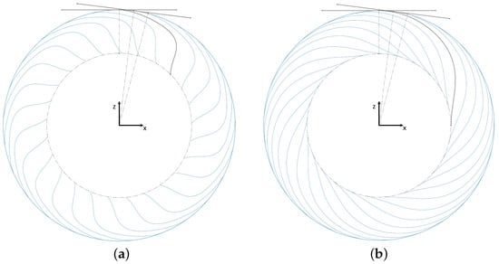 For the spiral (superimposed with cosine) design, two spoke geometries were examined: (i) a 45-degree offset and (ii) a 90-degree offset between the inner and outer edges of the spokes with reference to a coordinate origin in the center of the tire. They are depicted in Figure 6, accompanied by their respective empirical spoke design equations (in Equation (2), the parameters are equal to those in Equation (1)). Hereafter, these configurations will be identified as “Spiral45” and “Spiral90” for ease of reference.