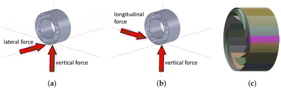 For the lateral load case, a lateral force of kN and a vertical force of kN were applied to the tire (see Figure 7a), while for the longitudinal load case, the forces were kN and kN in the longitudinal direction and in the vertical direction (see Figure 7b), respectively. For these load cases, the contact between the tire and the ground was not modeled, since sliding over the ground would generate a dynamic problem. To apply the loads, the contact patch was approximated with the selected set of nodes shown in Figure 7c; purple dots represent the nodes of the patch, which made up of the tire outer ring.