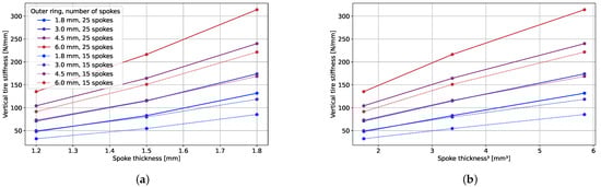 GFRP stackups’ vertical stiffness × (a) spoke thickness and (b) third order of spoke thickness (proportional to moment of inertia).