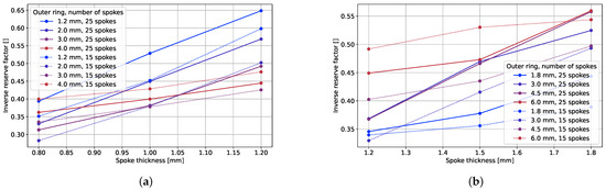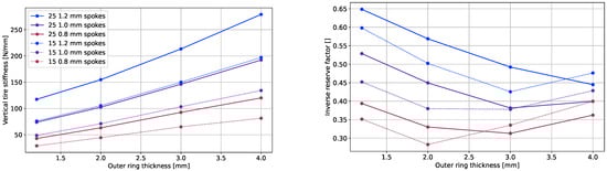 Figure 9 illustrates the impact of the spoke thickness on the vertical tire stiffness. An increase in the spoke thickness corresponds to an augmentation in the vertical stiffness. If the spokes are regarded as bending beams, the stiffness can be assumed to increase with the third power of the thickness. To identify a potential correlation with the NPT vertical stiffness behavior, the vertical stiffness was graphed against the third power of the spoke thickness, shown in the right plot of Figure 9. Notably, the NPT stiffness exhibited a robust correlation with the third power of thickness for thin outer rings, as indicated by the constant slope. However, for thicker outer rings, this correlation diminished, resulting in a less pronounced increase in the vertical stiffness with an increasing spoke thickness. The inverse reserve factor also increased with the spoke thicknesses, as shown in Figure 10. This can also be explained by the analogy to a bending beam: higher thicknesses lead to higher strains at an equal applied displacement.