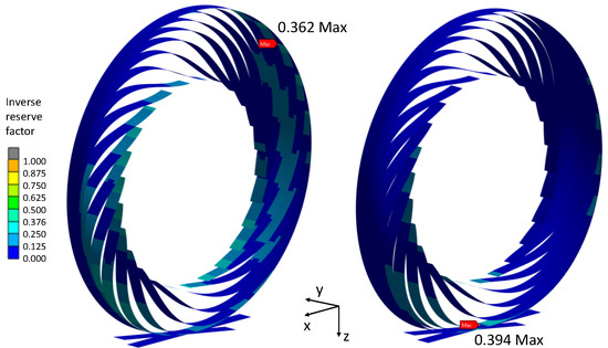 The outcomes of the cosine design study revealed that there was no IRF lower than within the design points featuring the required vertical stiffness. Due to the large number of analyses performed, the IRF results were compressed and are presented in Appendix A. Nevertheless, it was observed that elevated amplitudes of the cosine function ( vs. ), and consequently greater spoke thicknesses (to achieve the required equivalent vertical stiffness), resulted in a lower IRF within the spokes, as long as bottom-loading behavior was dominant. This phenomenon can be rationalized through an analogy to a bending beam: longer bending beams with an equivalent bending stiffness to shorter ones can sustain a greater load at the same stiffness, owing to their increased thickness. With small cosine amplitudes (), this was not the case anymore, because these concepts mainly featured top-loading behavior, enhancing the load-carrying ability. However, to achieve the desired vertical stiffness, the cosine concept also featured extremely thin spokes (<0.2 mm), which are infeasible for manufacturing. In summary, this indicates that the load-carrying capacity of the cosine design is insufficient for non-elastomeric materials such as GFRPs and CFRPs.