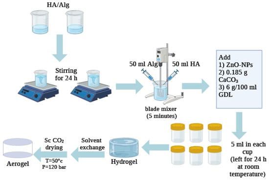 Prior to supercritical drying, hydrogels were subjected to a solvent exchange with ethanol to remove water from the gel network. The hydrogels were stepwise emerged in water/ethanol mixtures (70, 90, and 100% v/v), each step lasted 24 h. Solvent exchange started with a high concentration of ethanol to avoid the extraction of HA by the alcohol–water mixture [37]. The resulting alcogels were dried with supercritical CO2 at a constant temperature of 50 °C and a pressure of 120 bar. The continuous flow of CO2 (20–80 g/min) was set until complete extraction of ethanol was completed (~3 h), followed by a slow depressurization of the autoclave (1–3 bar/min). Once the ambient pressure was reached, the autoclave was opened, and the samples were collected. The main steps of preparation of HA/Alg composites with ZnO-NPs are summarized in Figure 1.