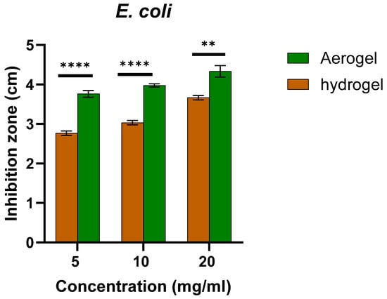 Figure 2. The antibacterial activity of ZnO NPs-loaded hydrogel and ZnO NPs-loaded aerogel against E. coli in mean of inhibition zone. ** means p ≤ 0.01, **** means p ≤ 0.0001. Error bars represent the standard deviation (n = 3).