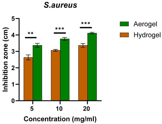 Figure 3. The antibacterial activity of ZnO NPs-loaded hydrogel and ZnO NPs-loaded aerogel against S. aureus in mean of inhibition zone. ** means p ≤ 0.01, *** means p ≤ 0.001. Error bars represent the standard deviation (n = 3).