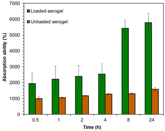 Figure 4. Results of the fluid uptake ability of HA/Alg ZnO-loaded (20 mg/mL) and ZnO-free aerogel.