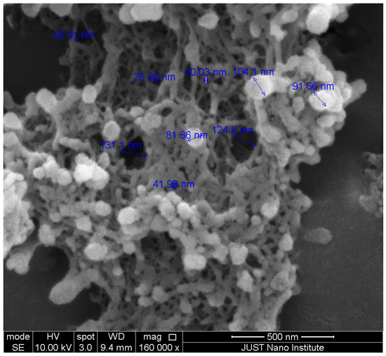 The result for ZnO-free aerogel agrees with the study by Athamneh et al. (2019), which reported BET surface area of hybrid Alg/HA aerogels in the range 450–610 m2/g [37]. The drop in the surface area for ZnO-loaded aerogel cannot be explained by an increase in the sample weight since the ZnO-NPs also carry a certain surface area. From the supplier specification, the BET surface of pristine ZnO-NPs is in the range of 10–25 m2/g. Given the density of the bulk ZnO of 5.61 g/cm3, the nanoparticle size can be estimated to be 21–53 nm (assuming ideal sphericity; roughly in agreement with Figure 5). The specific surface area of a composite aerogel S A + B (with no synergy effects) can be estimated as follows: