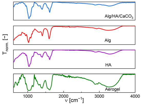 Figure 6. FTIR spectra of Alg/HA/CaCO3 physical mixture, plain Alg, plain HA, and Alg-HA aerogel loaded with ZnO-NPs (20 mg/mL). The transmittance is expressed as normalized values.