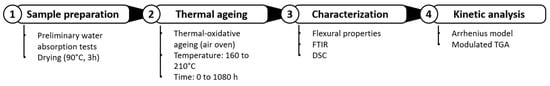 Overview of the experimental procedure: (1) sample preparation; (2) thermal–oxidative ageing; (3) characterisation; (4) kinetic analysis.