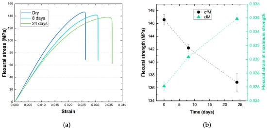 Flexural stress–strain curves (a) and trends of flexural properties (b) for PA-GF samples obtained by three-point bending test of specimen 0, 8, and 24 days after drying, upon exposure to humidity at 25 °C and 60% RH.