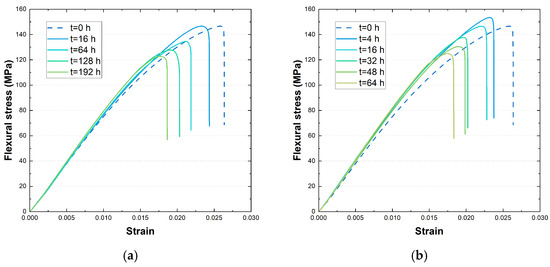 Given the significant moisture sensitivity of the composites, as evidenced by preliminary testing, all mechanical tests on aged samples were conducted on specimens that had been previously conditioned in a desiccator for 24 h. This step guaranteed that the observed effects of thermal ageing were not affected by any residual moisture in the samples.