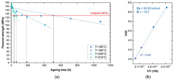 Flexural strength data gathered from mechanical testing at different ageing times and temperatures (Table 2) have been used to model a lifetime prediction method through the Arrhenius Equation (1), which can be linearised into Equation (2):