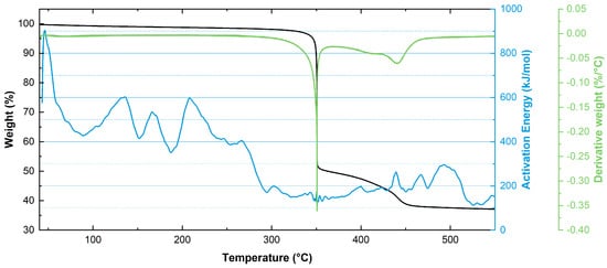 Modulated thermogravimetry analysis, displaying the TGA curve in black, the DTG curve in green, and the calculated activation energy in blue.