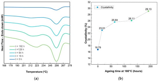 For aged specimens reported in Figure 6, a secondary melting peak emerged, increasing in intensity and shifting with ageing time and temperature. For example, the secondary peak temperature increased from 208 °C to 221 °C for samples aged at 180 °C for 16 to 192 h, respectively. Similar trends were observed at other ageing temperatures when the ageing time increased, as shown in the DSC plots reported in SM (Figure S8). The primary melting peak, however, remained stable, ranging between 256 °C and 259 °C.