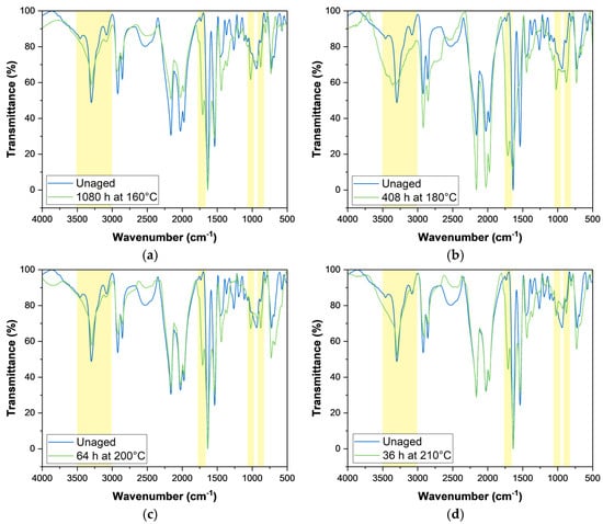 The ATR-FTIR spectra in Figure 7 compare the unaged sample with those aged for the longest durations at each temperature, highlighting several key chemical and structural changes.