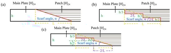 - Psarras, S.; Loutas, T.; Papanaoum, M.; Triantopoulos, O.K.; Kostopoulos, V. Investigating the effect of stepped scarf repair ratio in repaired CFRP laminates under compressive loading. J. Compos. Sci. 2020, 4, 153. [Google Scholar] [CrossRef]