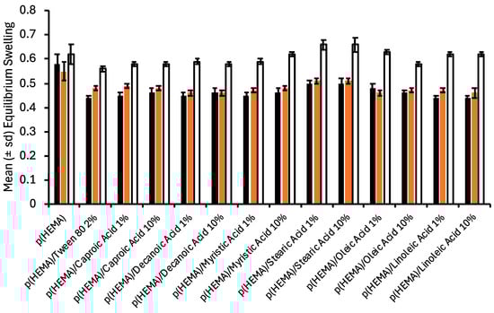 The effect of incorporation of fatty acids on the equilibrium swelling of p(HEMA) hydrogels * (black bars refer to equilibrium swelling in deionised water, red bars refer to equilibrium swelling in artificial urine pH 6, and clear bars refer to equilibrium swelling in artificial urine pH 9). * All fatty acid-containing hydrogels contained 2% Tween® 80.