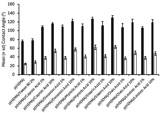 Contact angle analysis of fatty acid containing p(HEMA) biomaterials * (black bars refer to advancing contact angles, and clear bars refer to receding contact angles). * All fatty acid containing hydrogels contained 2% Tween® 80.