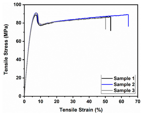 | Sample | Tensile Modulus a (GPa) | Tensile Strength (MPa) | Elongation at Break (%) | Static Toughness b (MJ/m3) |