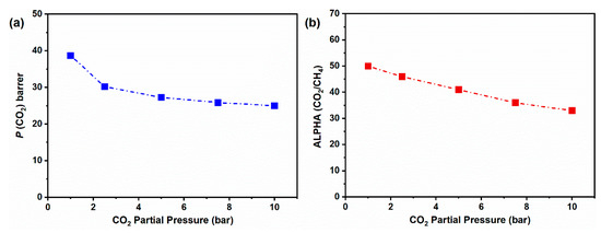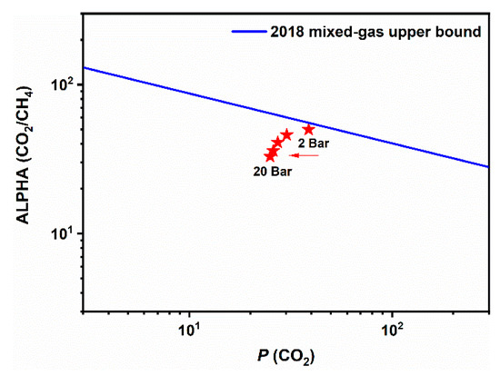 | Gas Species | Pressure | P (CO2) (Barrer) | P (CH4) (Barrer) | CO2/CH4 Selectivity |