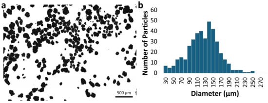 Optical microscopy analysis of the whole batch was carried out to assess the size distribution using a Zeiss Microscope Axio Imager.M2 microscope (Carl Zeiss S.p.A., Milano, Italy) and applying the ImageJ software with the NanoDefiner tool in order to recognise the particles from the images taken [24,25]. Mass-based size distribution was generated from the number-based data considering spherical particle shape and a particle density of 1.38 g/mL.