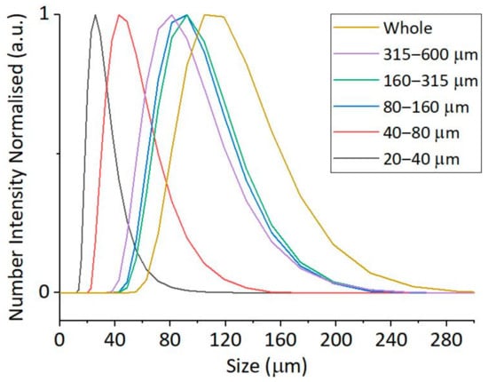 Size fractions generated by sieving from the original batch were also analysed by SLS. As the test material is intended for use in a particle number quantification process, the results from SLS, providing volume-based size distributions, were converted to number-based size distributions (Figure 3). The number-based size distribution of the individual fractions matched well with the size expected based on the cut-off values of the sieves in the lower size range (20–40, 40–80, and 80–160 µm). Meanwhile, results obtained for larger-size fractions (160–315 and 315–600 µm) suggested that the average size of particles is far below the mean of the size limits for the corresponding size classes. The original, unfractionated PVC-JRCNM70508a batch itself exhibits a broad size distribution in SLS analysis, ranging from approximately 60 µm to 300 µm, with the main population concentrated around 100–140 µm. The population of the smallest particles, which were separated by sieving (from 20 to 40 µm), is not detected in the analysis of the original (“Whole”) sample due to the higher concentration and light scattering capacity of the larger particles.