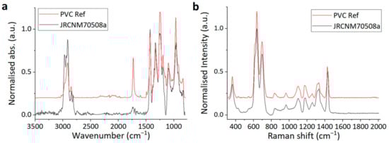FT-IR (a) and Raman (b) spectra of PVC sample PVC-JRCNM70508a and a reference spectrum of PVC for each.