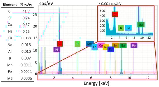 The chlorine content and the presence of negligible metal contamination of the selected material have been confirmed by various methods. The semi-quantitative analysis by ICP-MS indicated that the chlorine content of the sample was much higher than the value suggested by the local measurement by EDX, but in the right order of magnitude compared to the theoretically expected mass percentage contribution of Cl in pure PVC (i.e., 56.7% w/w). ICP-MS analysis did not reveal the presence of major metallic additives. The TXRF analysis confirmed these results; no unexpected elements were detected in the sample (Figure 7):