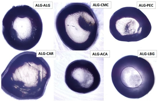 The microstructures of the beads observed under the optical microscope are depicted in Figure 1. The images revealed that the control (ALG-ALG) microbeads exhibited the most spherical and uniform structure among the experimental groups. A central core surrounded by a homogeneous structure was apparent in the ALG-ALG beads. In the ALG-CMC structure, some irregularities and cracks were observed. Among all the beads, ALG-CAR appeared to be the largest in diameter, while ALG-ACA was the smallest. Furthermore, the composite ALG beads containing ACA, followed by PEC, exhibited a denser structure compared to the control and other experimental beads. This outcome was consistent with previous analysis findings and the hypothesis of Niu et al. [25]. The compact configuration in ALG-ACA and ALG-PEC was expected to contribute to slower release rates, which were identified in subsequent analyses. Among the samples, ALG-LGB was the only microbead exhibiting circular structures. The presence of pores and their relationship with the release profile were investigated through further analyses in this study.