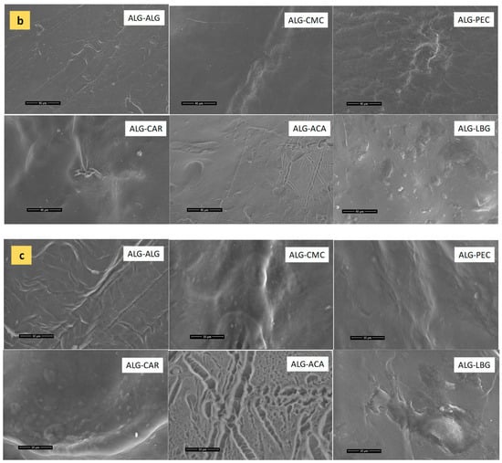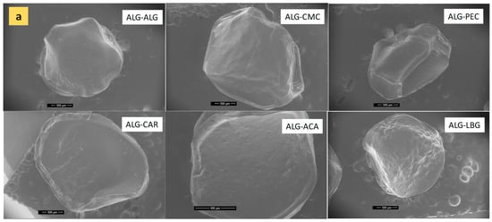 The microstructural observations of microbeads under SEM are presented in Figure 2a–c. The particle size measurements observed in the images were consistent with the values given in Table 1 and the optical images in Figure 1. Briefly, the ALG-ACA microbeads presented the smallest diameter compared to the other samples. ALG-ALG microbeads (the control samples) exhibited the most uniform and spherical structure. The ALG-CMC and ALG-PEC microbeads were generally spherical in shape but also exhibited flat regions. Specifically, ALG-PEC displayed diagonal features resembling a rectangular prism. The ALG-CAR, ALG-ACA, and ALG-LBG microbeads revealed oval structures. At high magnifications, a porous structure was not distinctly observed in the products; however, rough textures were present in all products. The roughest surface was observed in ALG-LBG microbeads. This could also indicate an increase in the surface area available for the release of encapsulated material. In a study investigating the most suitable material for the encapsulation of polyphenols, when pectin, cellulose derivatives, and whey proteins were incorporated with alginate, similarly to our results, the smoothest surface was observed in plain alginate microbeads [28].