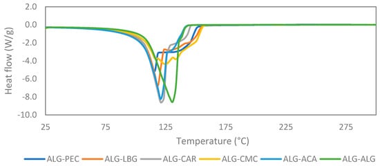 DSC curves provide insights into the thermal properties of materials to determine their potential applications and evaluate the processing parameters. The curves of the microbeads exhibited similar trends with slight variations (Figure 5). All of the samples presented one distinct endothermic peak between approximately 110 °C and 130 °C. The endothermic peaks observed above 100 °C were attributed to dehydration, subsequently followed by decomposition. The precise maximum heat absorption peaks, corresponding to the decomposition temperatures, for ALG-ALG, ALG-CAR, ALG-ACA, ALG-LBG, and ALG-PEC appeared at 130.8 °C, 121.0 °C, 120.9 °C, 118.5 °C, and 116.0 °C, respectively. The ALG-CMC microbeads revealed two overlapping degradation peaks (at 125.9 °C and 133.4 °C), and these peaks were not as sharp as those in other microbeads. This can be attributed to a more heterogeneous structure of ALG-CMC composites. The control microbeads (ALG-ALG) exhibited a single sharp peak due to their homogeneous structure. The incorporation of other hydrocolloids resulted in broader but lower peaks in DSC curves.