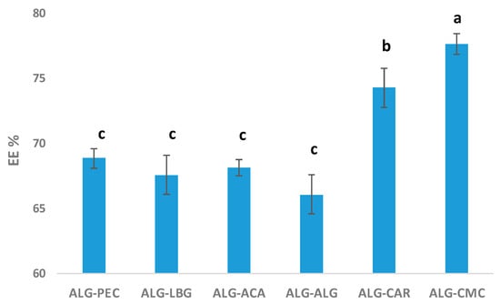 Encapsulation efficiencies (EEs%) of microbeads. Different letters “a–c” represent statistical differences according to Tukey’s test (p < 0.05).
