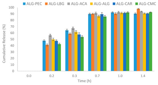 Based on the R2 values of the kinetic models (Table 2), none of the samples followed a zero-order release pattern, implying that the release of tartrazine from microbeads was concentration-dependent. The ALG-LBG and ALG-ACA microbeads exhibited release kinetics that were best described by the first-order model, while ALG-ALG, ALG-CMC, and ALG-CAR adhered to the Higuchi model. ALG-PEC’s release profile was consistent with the Korsmeyer–Peppas model. The n-kinetic exponent values for all products ranged from 0.12 to 0.20 (see Supplementary Figures S1–S4). In the Korsmeyer–Peppas plot, ALG-ACA exhibited the shallowest slope, whereas ALG-LBG demonstrated the steepest slope. This suggests that the slowest release occurred in ALG-ACA microbeads, while the fastest release occurred in ALG-LBG microbeads among all samples. Furthermore, the diffusional coefficient for tartrazine release indicated a pseudo-Fickian mechanism (n < 0.5) in all microbeads, suggesting both diffusion and matrix relaxation/swelling affect the release.